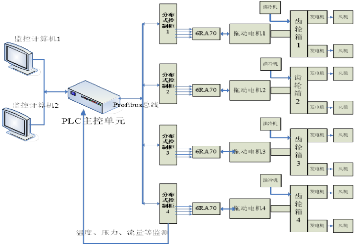 拖动控制系统的结构框图如下所示,该系统由2台监控计算机、西门子s7-300系列可编程逻辑控制器、4套分布式控制柜、4台拖动电机、4台西门子6RA70直流变频器、4套齿轮箱,4套油冷系统、8套风冷系统等组成。即每台拖动系统配有2套风冷系统和1套油冷系统,风冷系统通过总线进行远程控制。总系统实时监测参数多达100组以上,多点、全面、稳定的监控系统运行状态,分级处理异常状态,紧急状态自动停车保护。