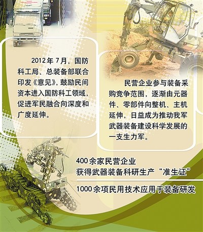 目前,已有400余家民营企业获得武器装备科研生产“准生证”,1000余项民用技术应用于装备研发,军民融合、寓军于民的武器装备科研生产体系已初具规模。